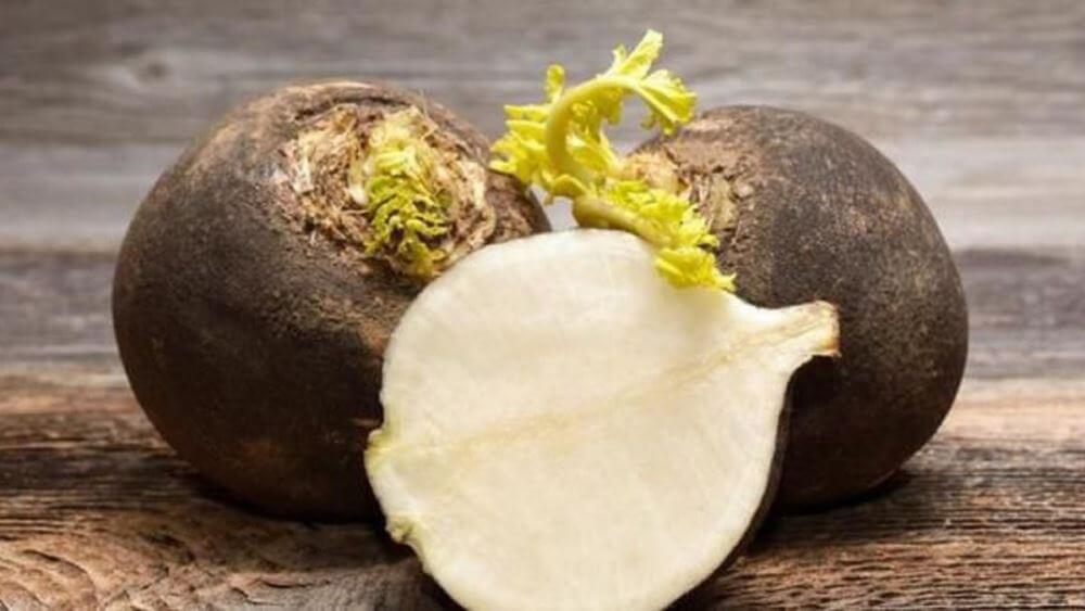 - Коренеплід. Варіюється за формою (круглий, овальний, циліндричний) і кольором (білий, чорний, зелений, рожевий або фіолетовий). Коренеплід має щільну структуру та насичений смак.